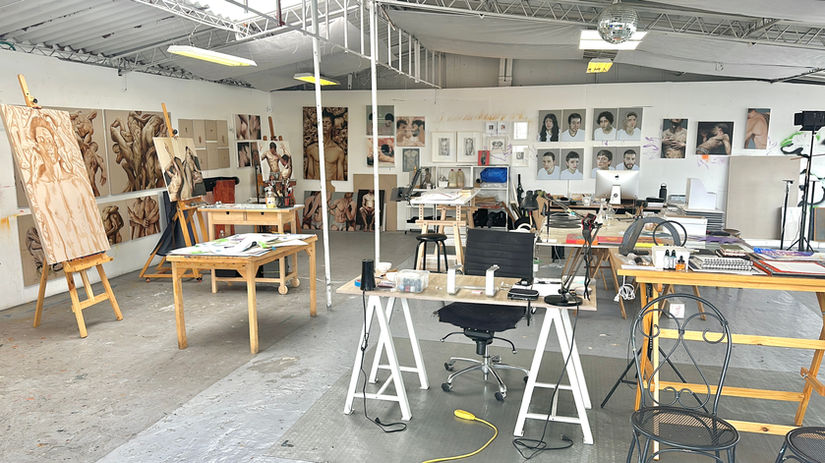 The studio occupies the top floor of a building in Bogotá's San Felipe neighborhood, designated as the city's creative district. This area boasts the highest concentration of galleries, artist studios, and cultural initiatives in Bogotá. Its location on Calle 72, just two blocks from Avenida Caracas —two of the city's main arteries— provides easy access to all urban areas. These conditions create an ideal environment for artistic creation, exchange, and reflection.